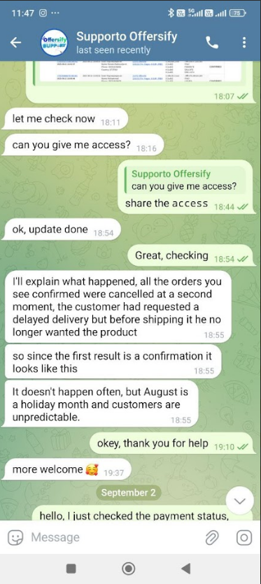 Сотрудник саппорта написал о низком проценте выкупа, жалобах клиентов и требованиях возврата денег. Хотя 50-60% — это нормальный средний выкуп. Кроме того, ответственность за выкуп несет в первую очередь рекламодатель. Offersify, как владелец инхаус-офферов, взаимодействует с курьерскими службами, видит статусы от курьерок и сам выкуп. Узнать о проблемах с выкупом AdCombo могли только от самого рекла. Но никаких сообщений о проблемах с трафиком или выкупом не было. До запроса на вывод крупной суммы.