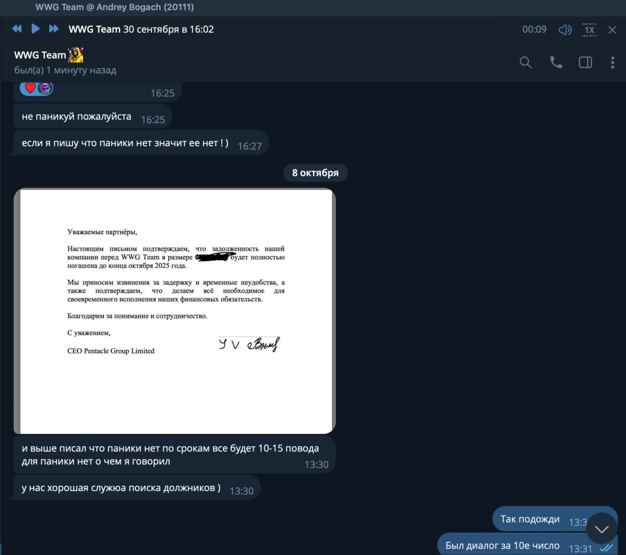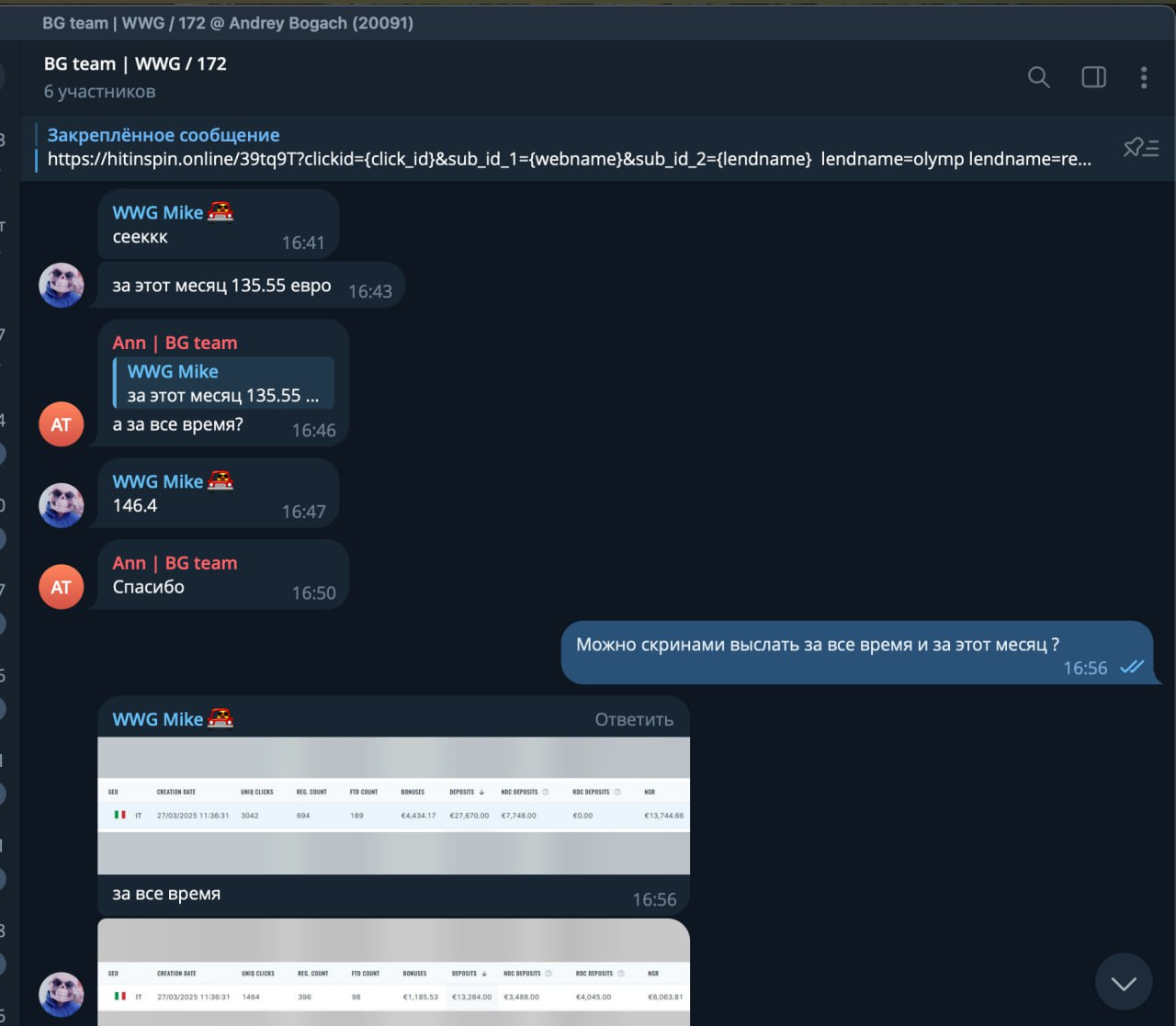 В октябре представители WWG организовали созвон с фаундером сети WWG Назаром. Он пообещал, если рекламодатель не закроет долг, партнерская сеть возьмет обязательства на себя. Это же обещание было зафиксировано в рабочей переписке.