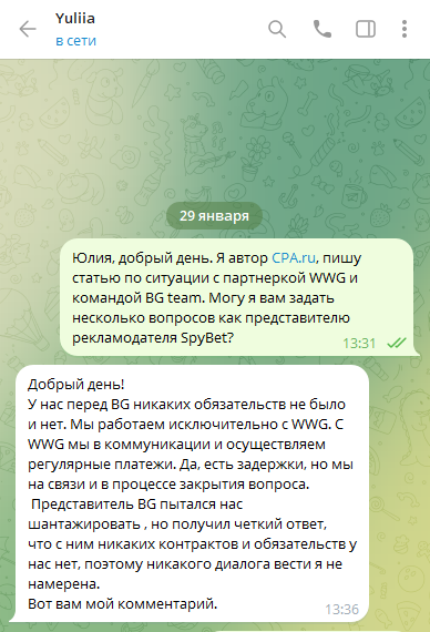 Когда в сентябре 2025 стало ясно, что у SpyBet начинаются финансовые сложности, WWG полностью остановили работу с брендом. При этом сеть не вышла из коммуникации и продолжила давление на рекламодателя, пытаясь добиться погашения долга перед BG Team. Но у SpyBet постоянно находятся причины не платить.