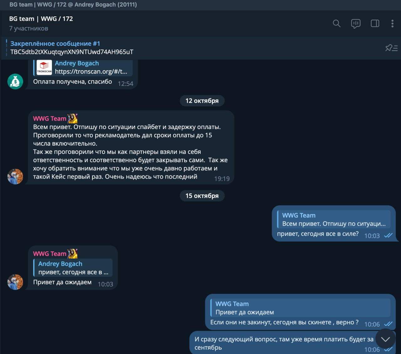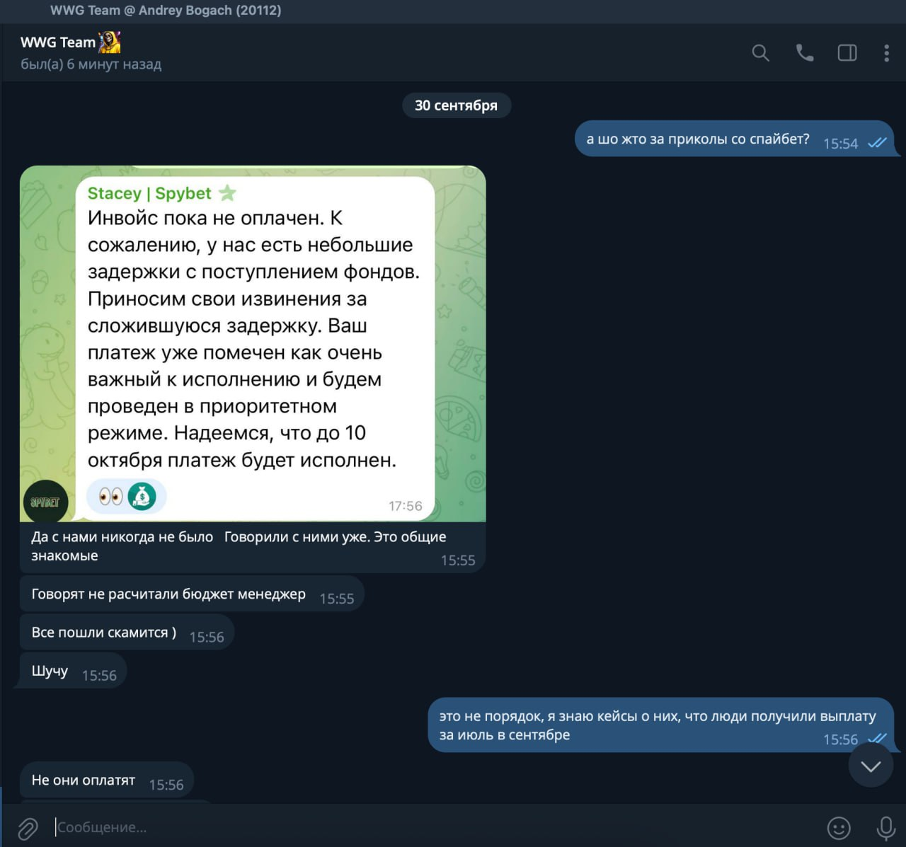 А по оплате рекламодатель Spybet выдвинул новый срок — 10-11 октября сделают транш сразу за два месяца. Несмотря на обещания, BG Team полностью стопает трафик. К этому моменту общая сумма задолженности составила $157 306.