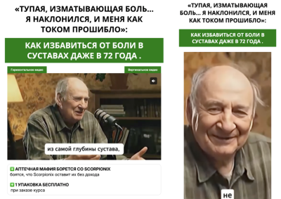 На экране — пожилой мужчина рассказывает интервьюеру, как избавился от боли в суставах. Всё видео, включая актёра и голос, сгенерировано ИИ.